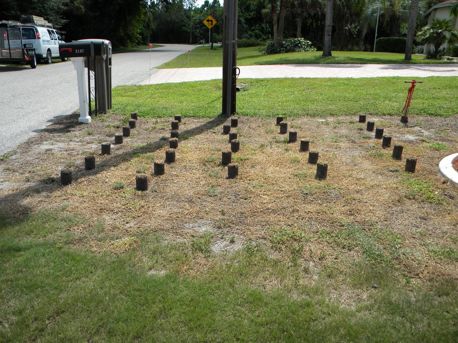 The white sand marks show where I pulled the healthy plugs. The cones mark the path of my internet and phone line locations.